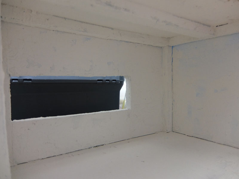 窓は100均小物入れの蓋部分。ドアは木片繋いで自作です。