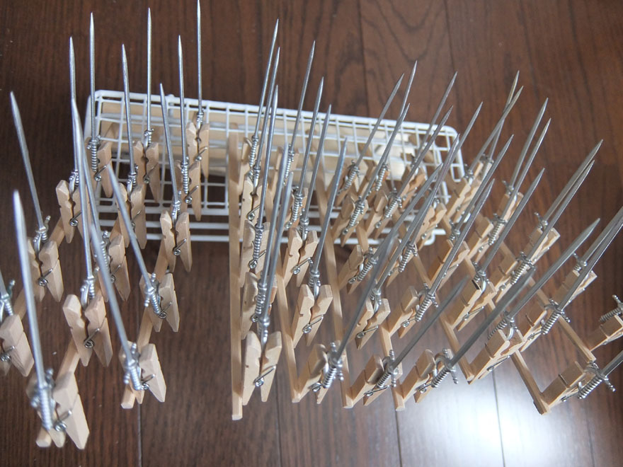 剣ピックを掴んでるのは100均の木製クリップを割り箸に付けたもの。